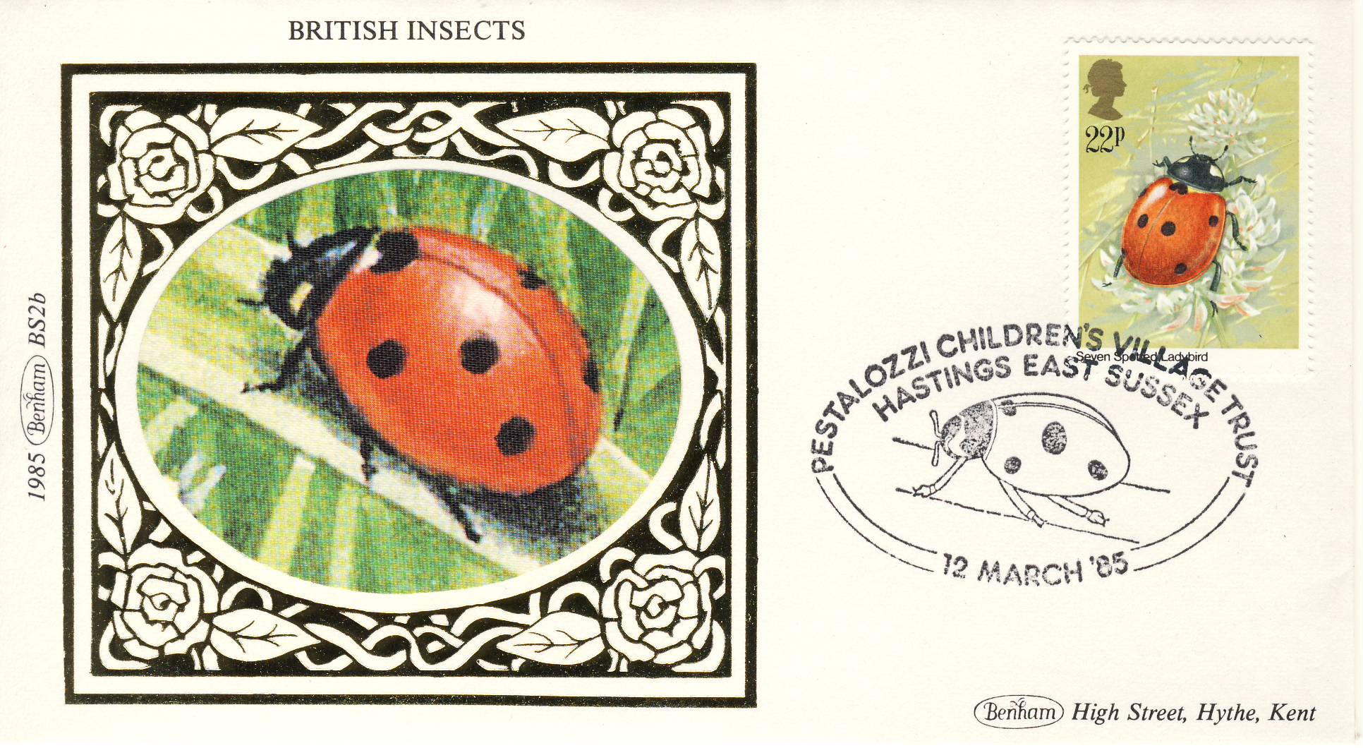 1985 BS2b BRITISH INSECTS Seven Spotted LadyBird stamp Benham Sm Silk Cover refF538 Postmarked PESTALOZZI Childrens Village Trust Hasting East Sussex 12th march 1985. Very good condition. Unsealed with insert card. Ideal for gift, money envelope etc