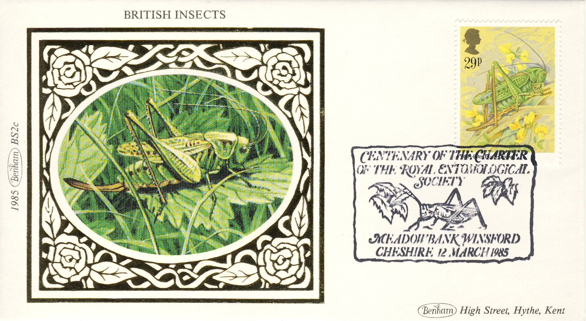 1985 BS2c BRITISH INSECTS stamp Benham Sm Silk Cover refF537 Postmarked Royal Entomological Society Meadowbank Winsford Cheshire 12th March 1985. Very good condition. Unsealed with insert card. Ideal for gift, money envelope etc