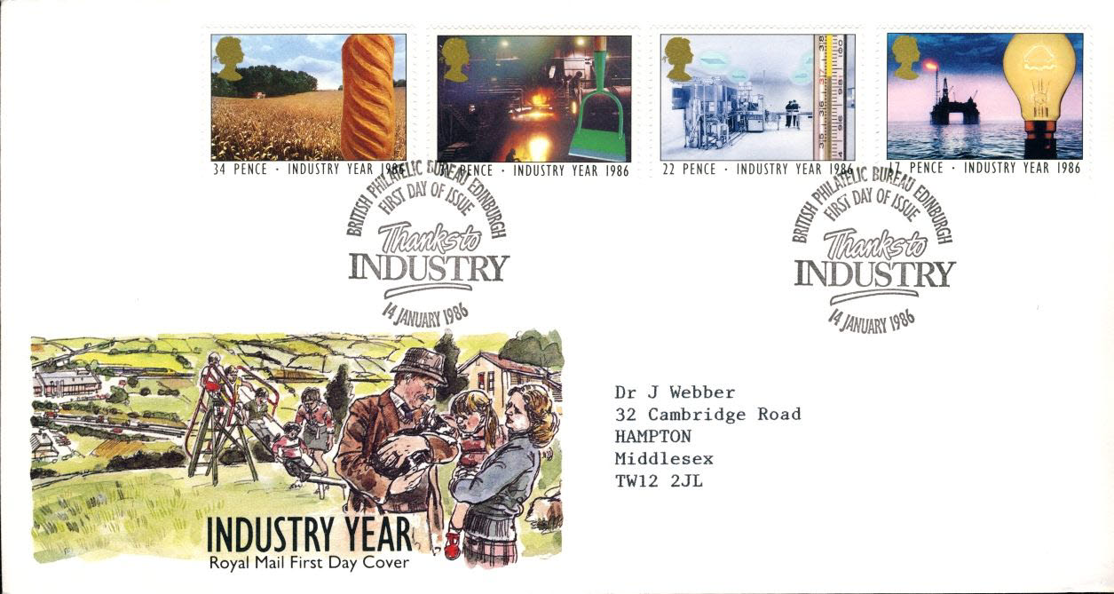 1986-01-14 Industry Year Stamps FDC refE153 Cover in good condition. Please see larger photo and full description for details.