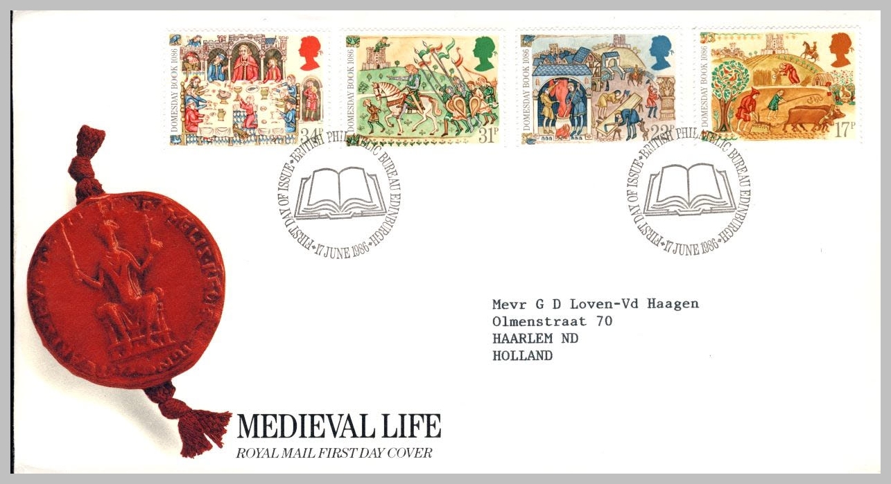 1986-06-17 Medieval Life Domesday Book Stamps FDC refE215 Cover in good condition. Please see larger photo and full description for details.