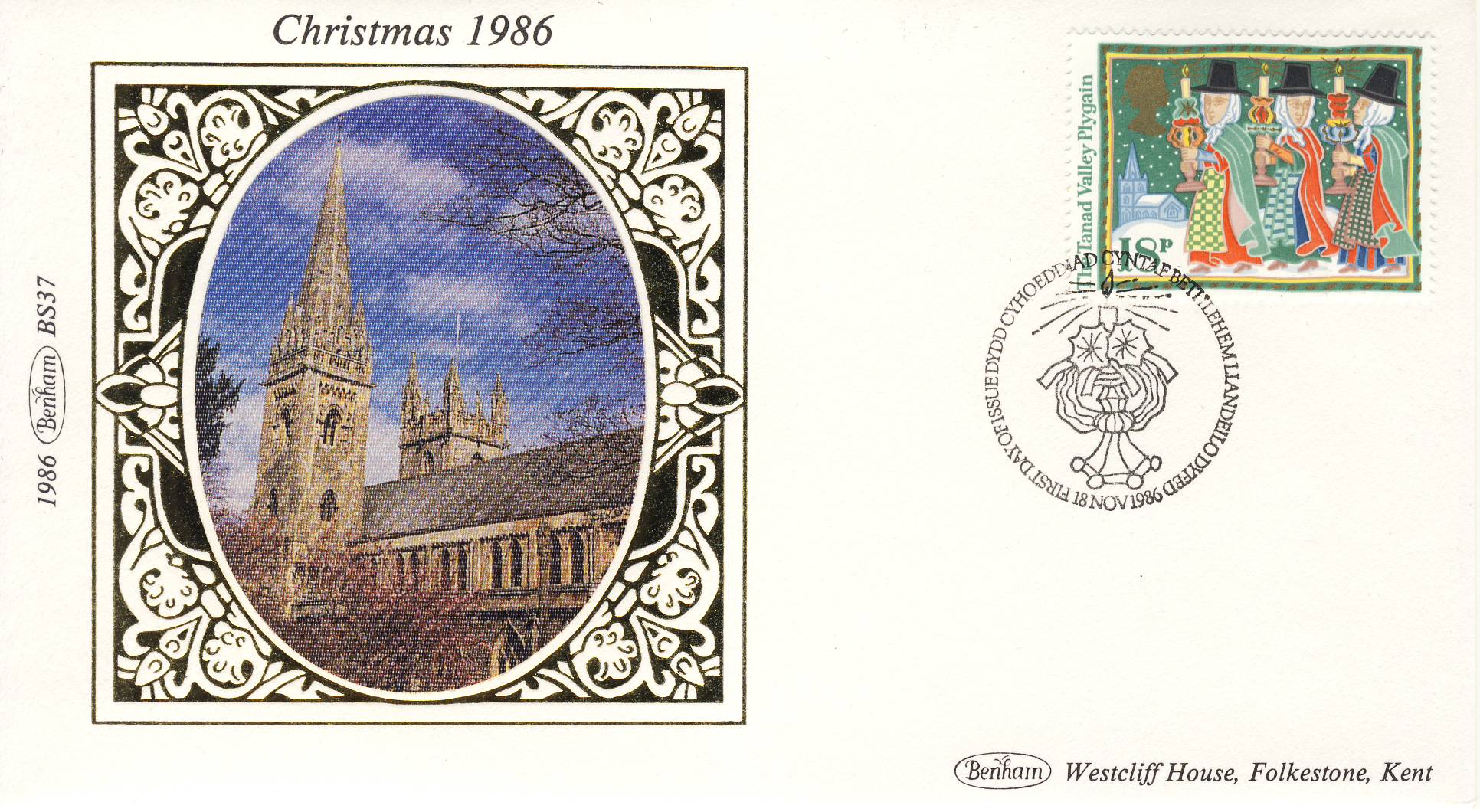 1986 BS37 CHRISTMAS LTD EDITION Benham Sm Silk Stamp Cover refF572 Postmarked 18 Nov 1986 Bethlehem Dyfed. The Tanad Valley Plygain 18p stamp. Very good condition. Unsealed with insert card. Ideal for gift, money envelope etc