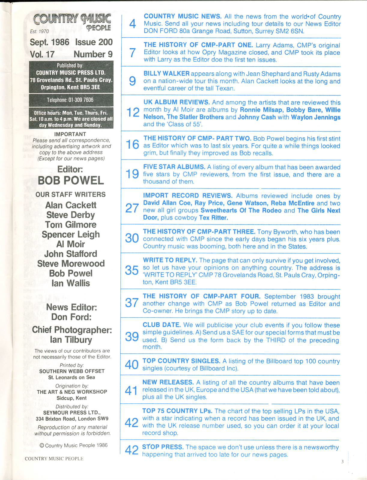 1986 September Country Music People magazine BILLY WALKER 200th edition ref102297