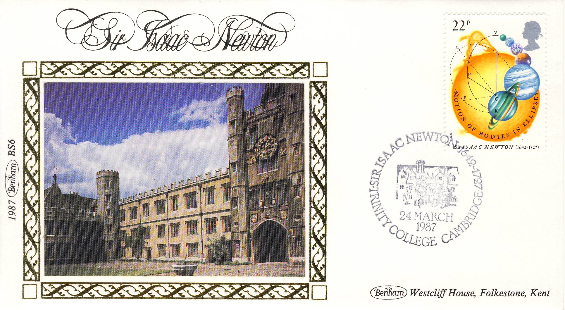 1987 BS6 LTD EDITION Sir Isaac Newton stamp Benham Sm Silk Cover refF530 Postmarked Trinity College Cambridge 24 march 1987. Very good condition. Unsealed with insert card. Ideal for gift, money envelope etc