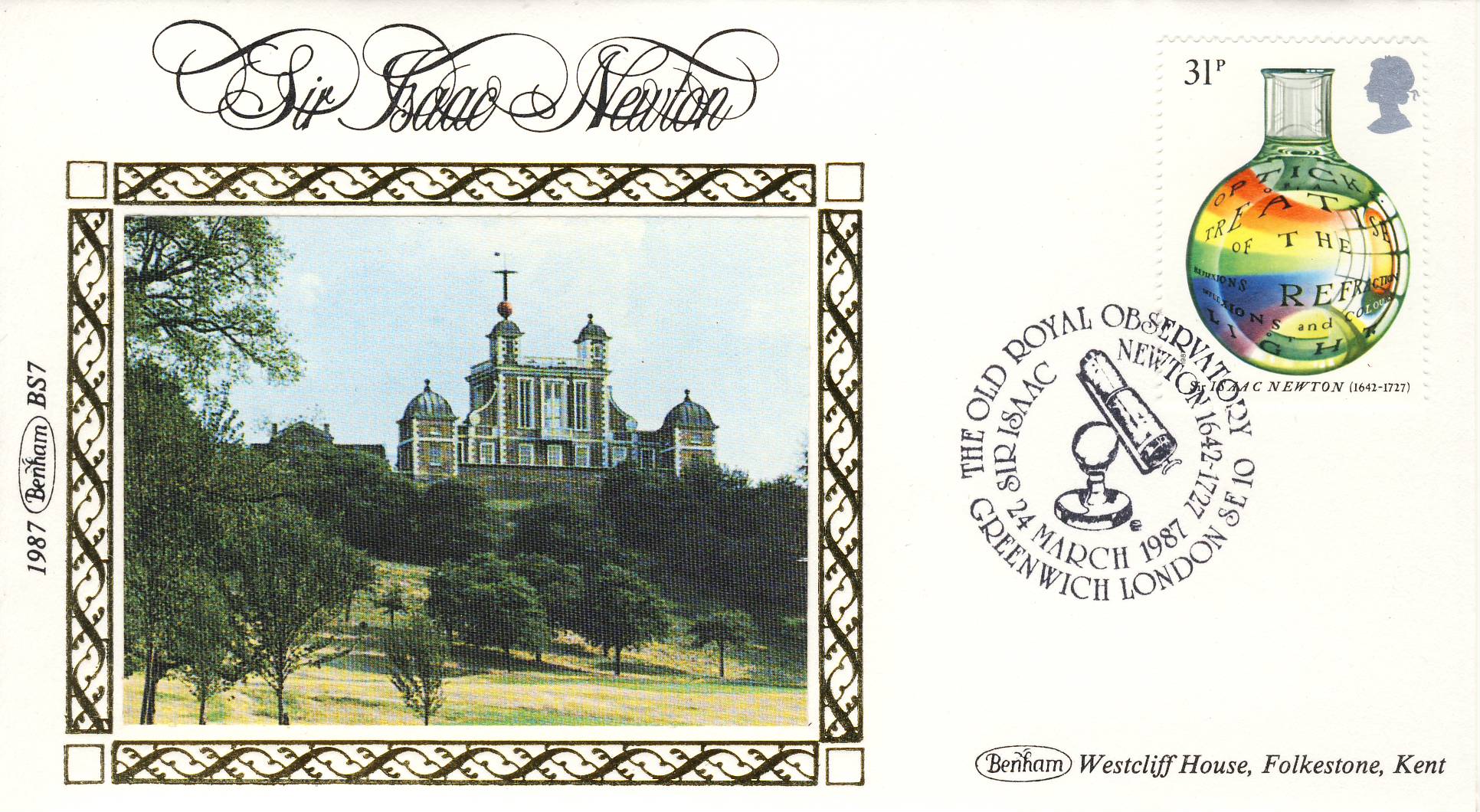 1987 BS7 LTD EDITION Sir Isaac Newton stamp Benham Sm Silk Cover refF544 Postmarked The Old Royal Observatory Greenwich London 24 march 1987 Limited Edition Very good condition. Unsealed with insert card. Ideal for gift, money envelope etc