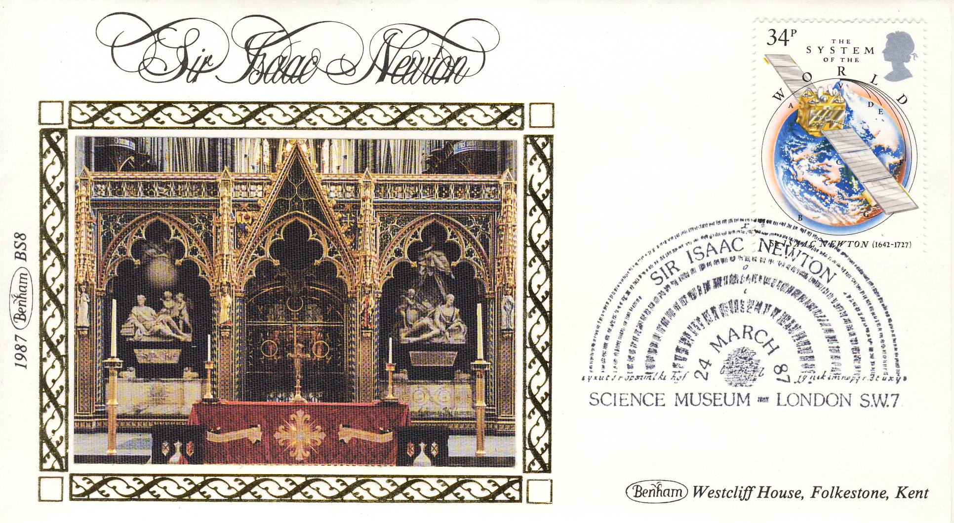 1987 BS8 Sir Isaac Newton LTD EDITION stamp Benham Sm Silk Cover refF543 Postmarked Science Museum London SW7 24th March 1987 Limited Edition Very good condition. Unsealed with insert card. Ideal for gift, money envelope etc