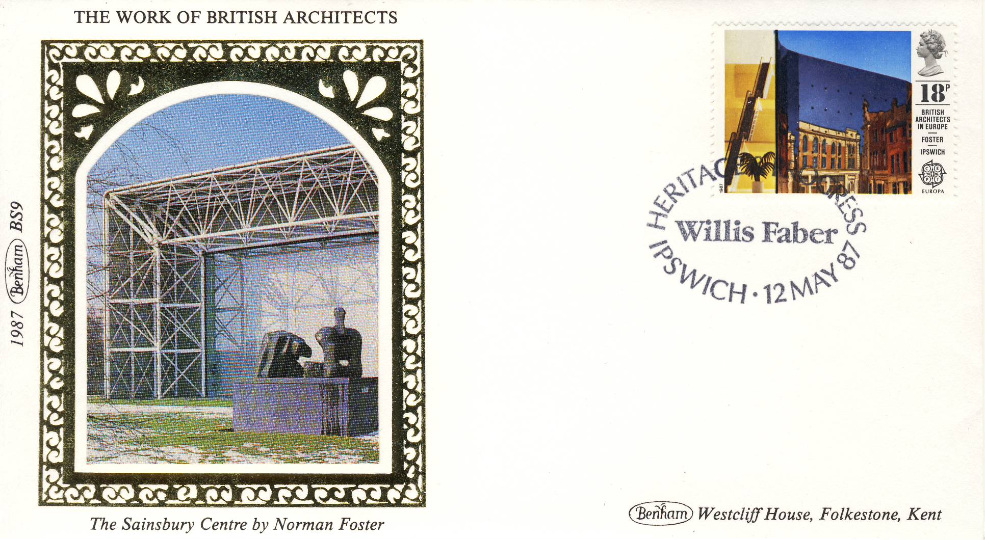 1987 BS9 Sainsbury Centre Norman Foster British Archictects LTD EDITION Benham Sm Silk Cover refF546 Postmarked Willis Faber ISPWICH 12th May 1987 Limited Edition Very good condition. Unsealed with insert card. Ideal for gift, money envelope etc