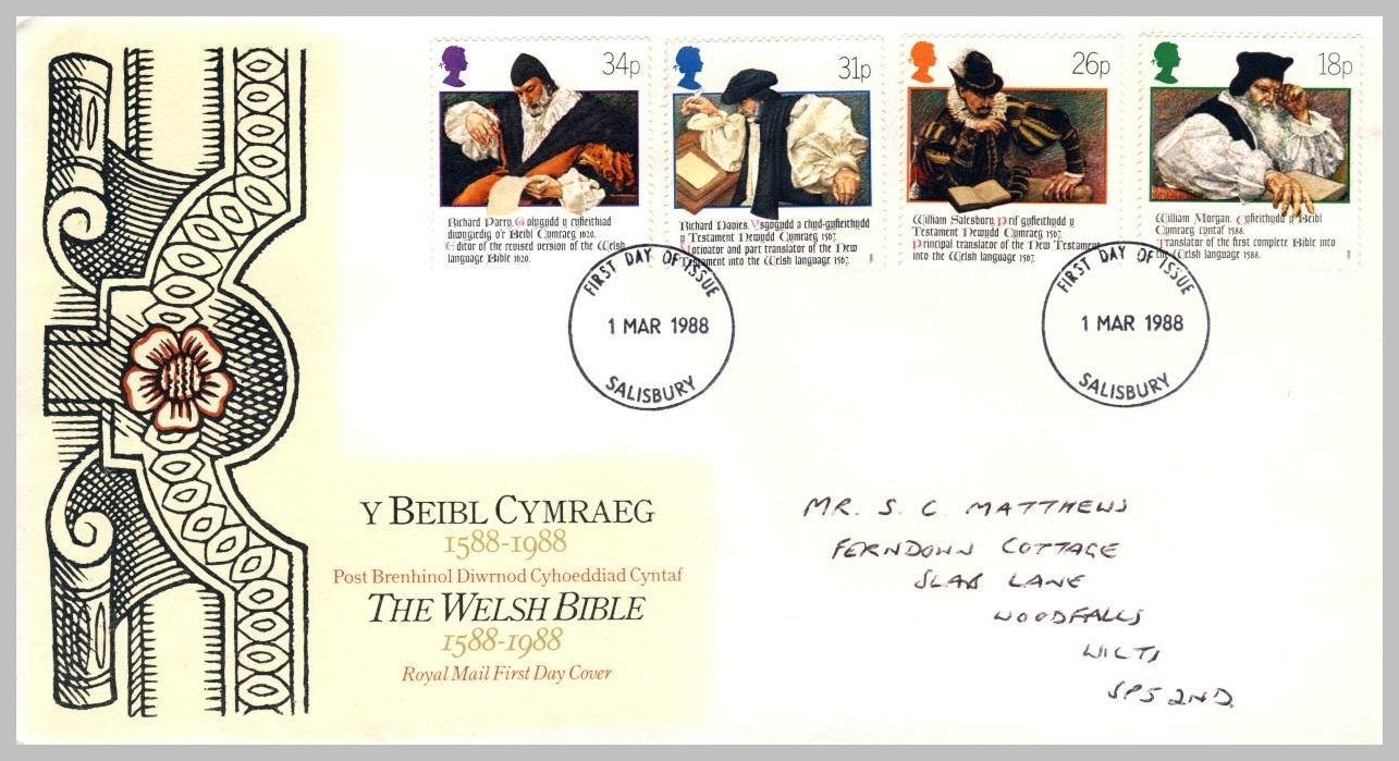 1988-03-01 Welsh Bible Stamps FDC Salisbury postmark fdi refE222