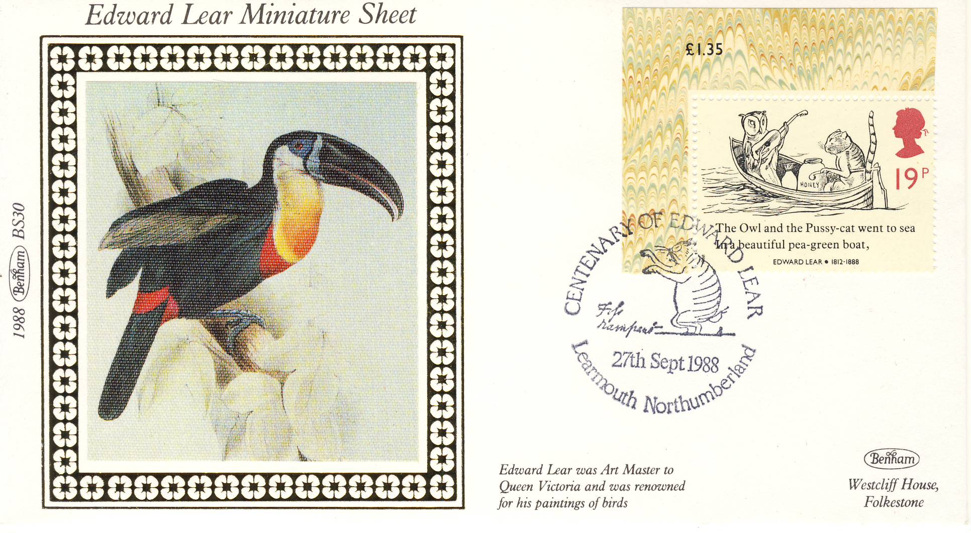 1988 BS30 Edward Lear Mini sheet Owl and Pussycat Benham Sm Silk Stamp Cover refF567