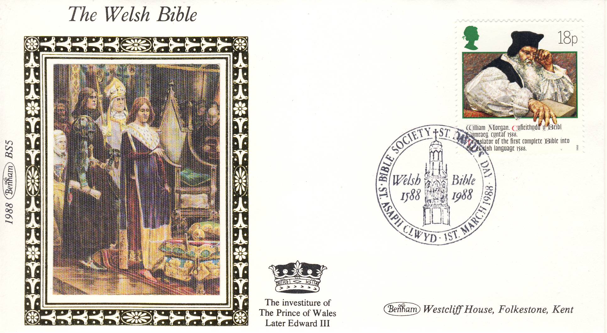 1988 BS5 Welsh Bible Prince of Wales Investiture LTD EDITION Benham Sm Silk Stamp Cover refF564 Postmarked St Davids Day St Asaph Clwyd 1st March 1988 Very good condition. Unsealed with insert card. Ideal for gift, money envelope etc