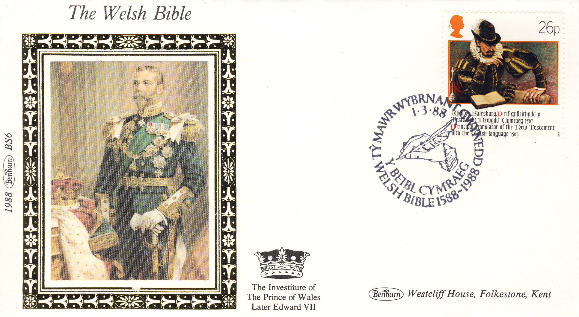 1988 BS6 William Morgan Welsh Bible Edward VII LTD EDITION Benham Sm Silk Stamp Cover refF563