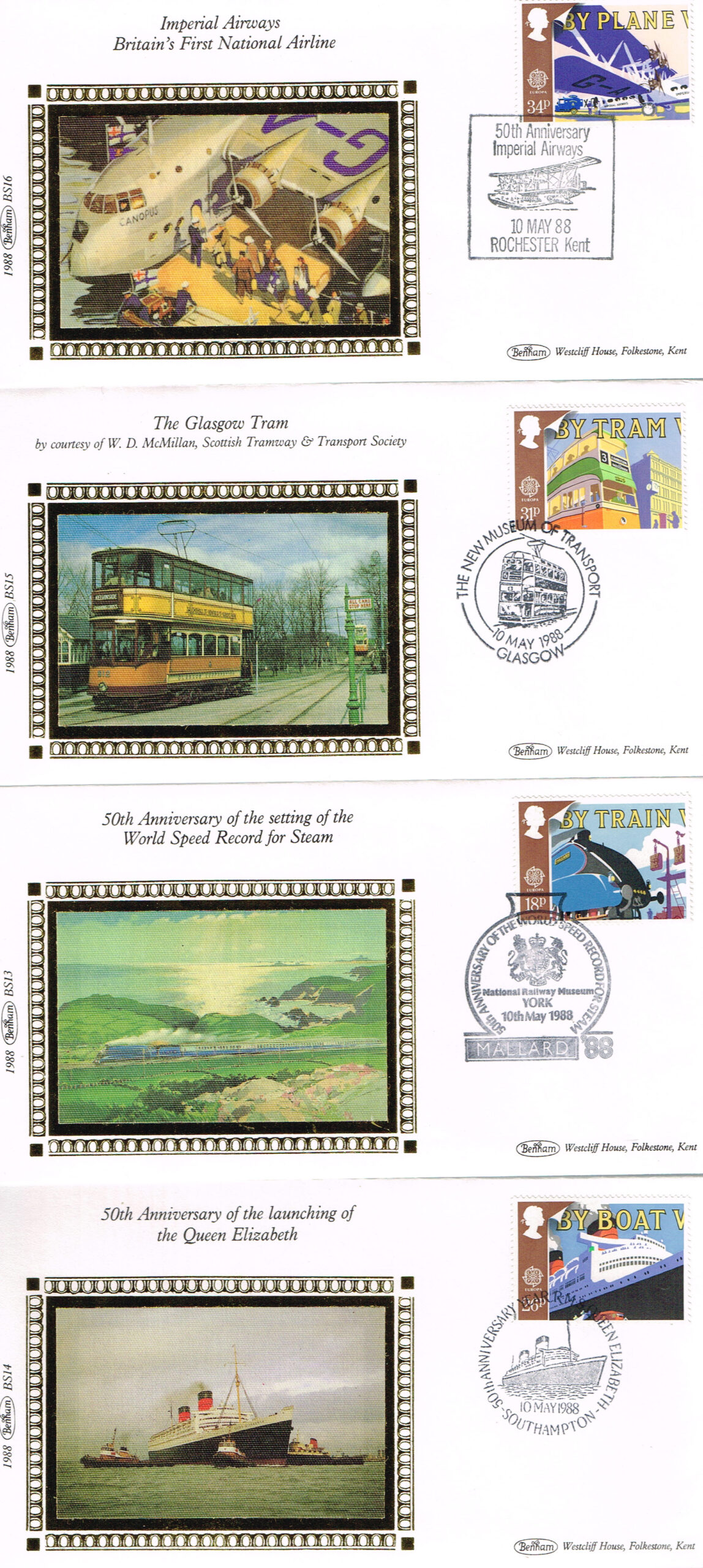 Limited Edtion of silk covers – no more than 5,000 produced. Imperial Airways, Glagow Tram, Queen Elizabeth Ocean Liner nad World Speed Record for Steam. Unsealed with insert cards. Various postmarks. Ideal Gift. Very good condition