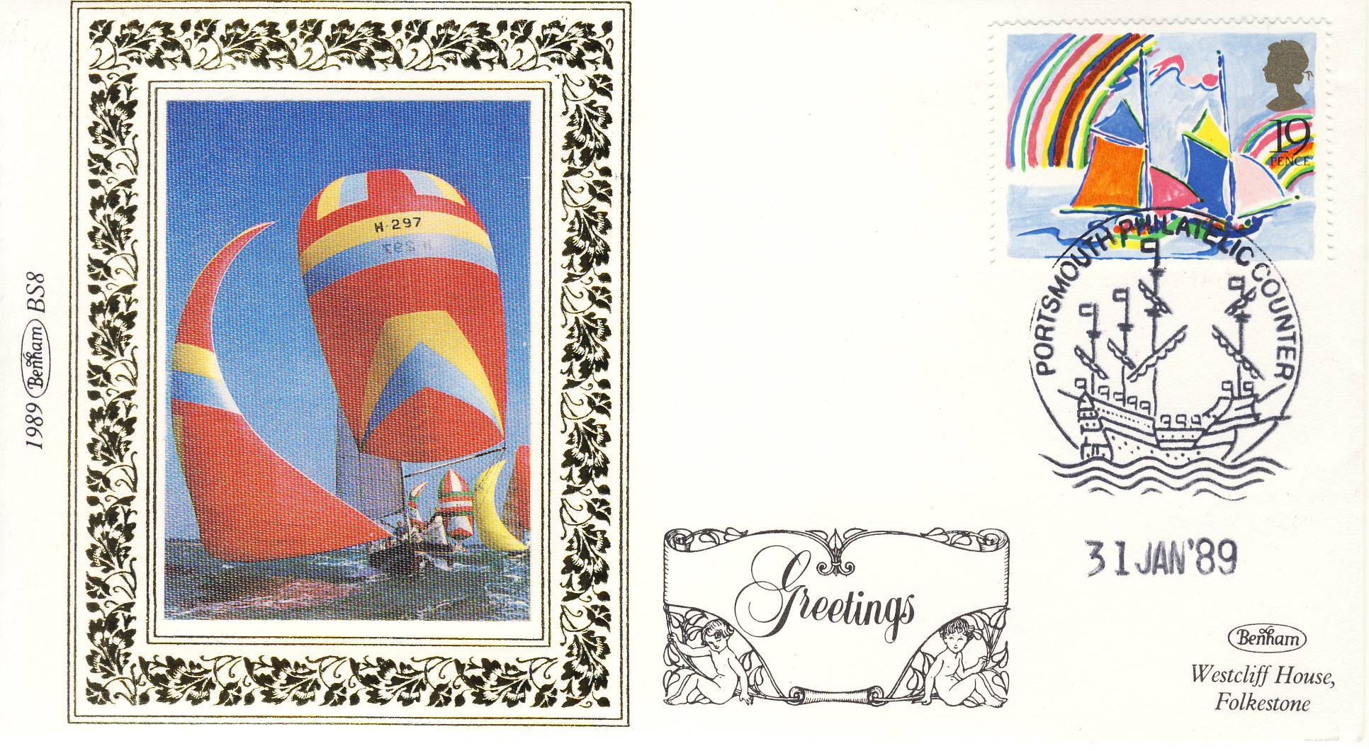 1989 BS8 Sailing Ships PORTSMOUTH LTD EDITION Benham Sm Silk Stamp Cover refF578 GREETINGS Postmarked 31 January 89 Very good condition. Unsealed with insert card. Ideal for gift, money envelope etc