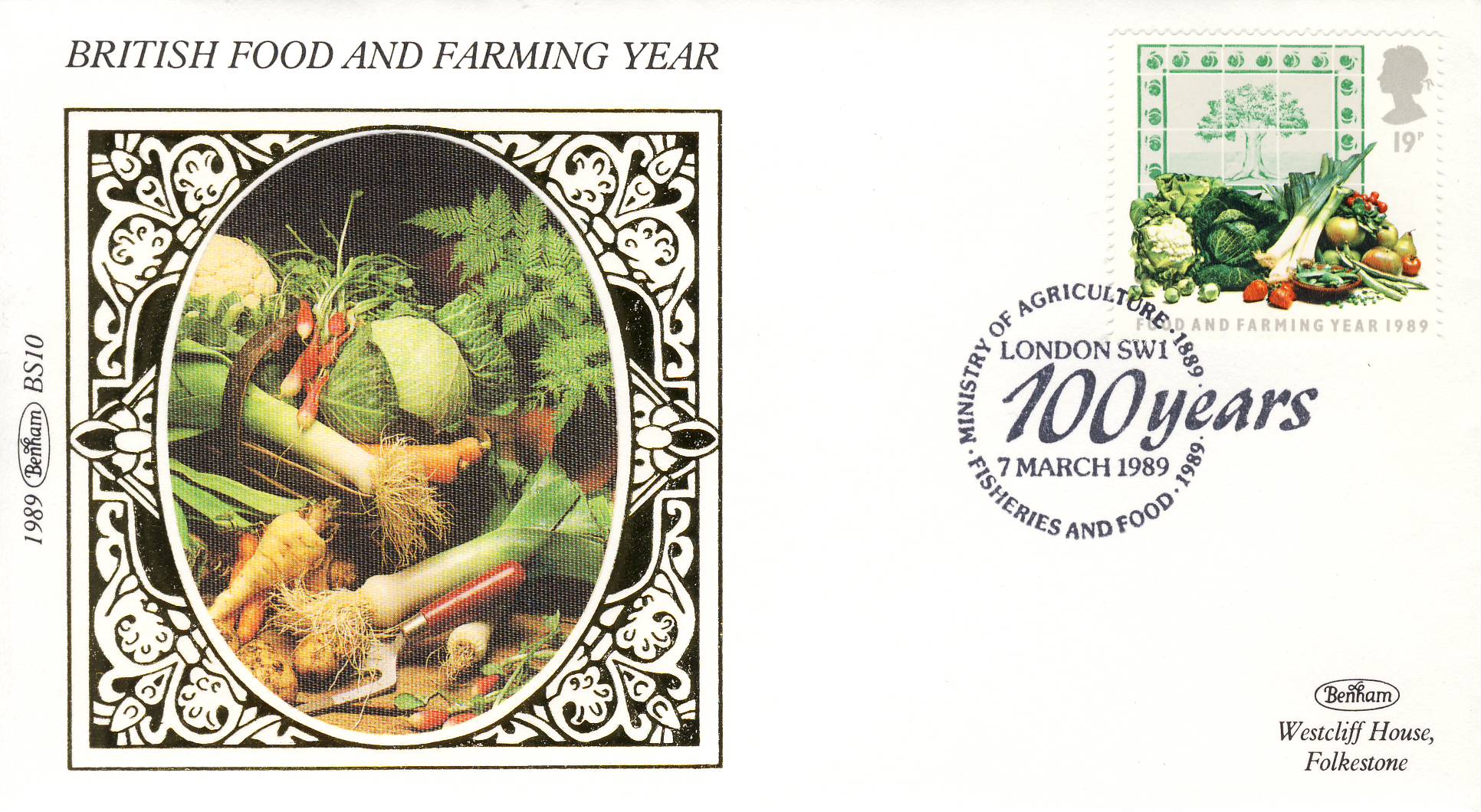 1989 LTD EDITION BS10 Food & Farming stamp Benham Sm Silk Cover refF524 Postmarked Ministry of Agriculture 100 years 7th March 1989 . Very good condition. Unsealed with insert card. Ideal for gift, money envelope etc