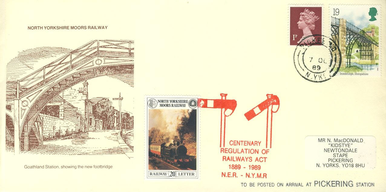 1989 N.E.R – N.Y.M.R. Centenary Regulation of Railways Act stamp cover PICKERING refD282