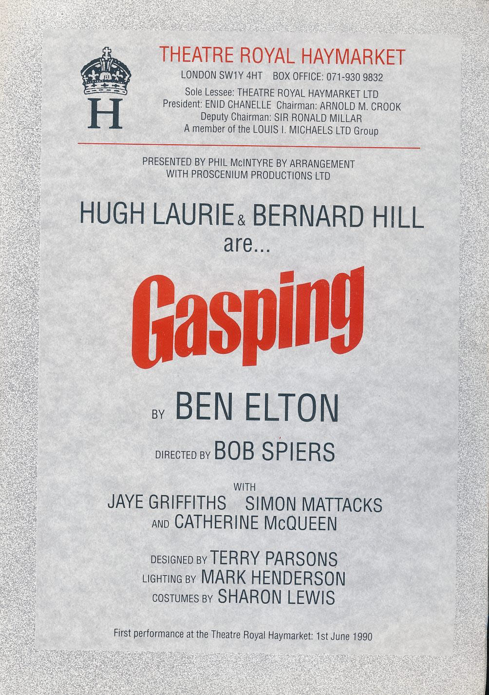 1990 Theatre Royal Haymarket Programme GASPING Hugh Laurie & Bernard Hill refb101076 Pre-owned Programme in Good Condition. Measures approx 17cm x 24cm