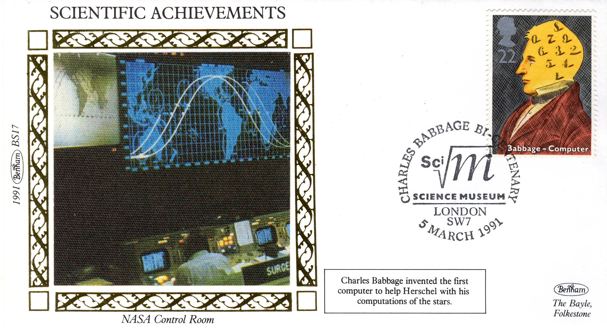 1991 BS17 Charles Babbage NASA Control Room LIMITED EDITION Benham Sm Silk Cover refF470 Scientific Achievements LIMITED EDITION with Science Museum London SW7 5th March 1991 postmark. Very good condition. Unsealed with insert card. Ideal for gift, money envelope etc