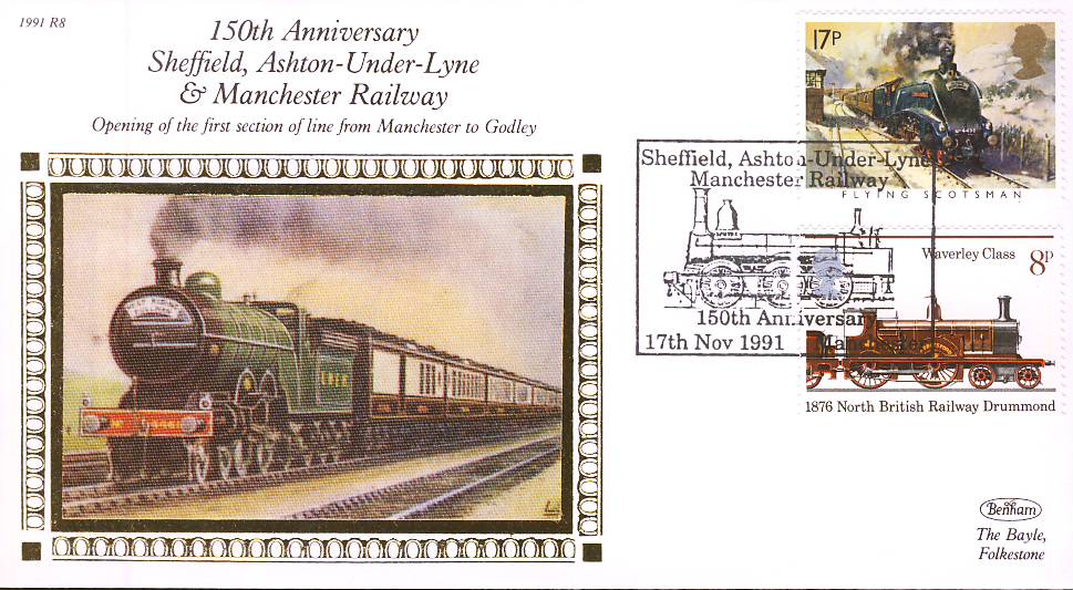 1991 R8 150th Anniversary of Sheffield Ashton Under Lyne Manchester Railway Benham Small Silk cover. Special handstamp. refA365