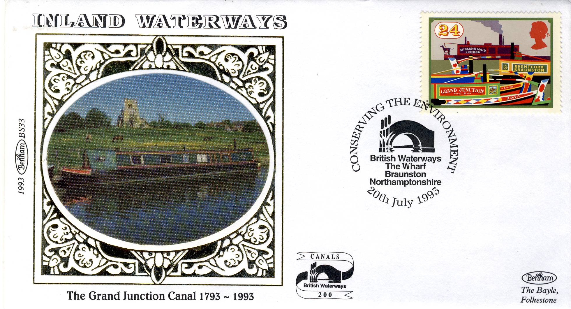 1993 BS33 Inland Waterways Grand Junction Canal LIMITED EDITION Benham Sm Silk Cover refF475 Postmarked Conserving the Environment The Wharf Braunston Northamptionshire 20th July 1993. Very good condition. Unsealed with insert card. Ideal for gift, money envelope etc