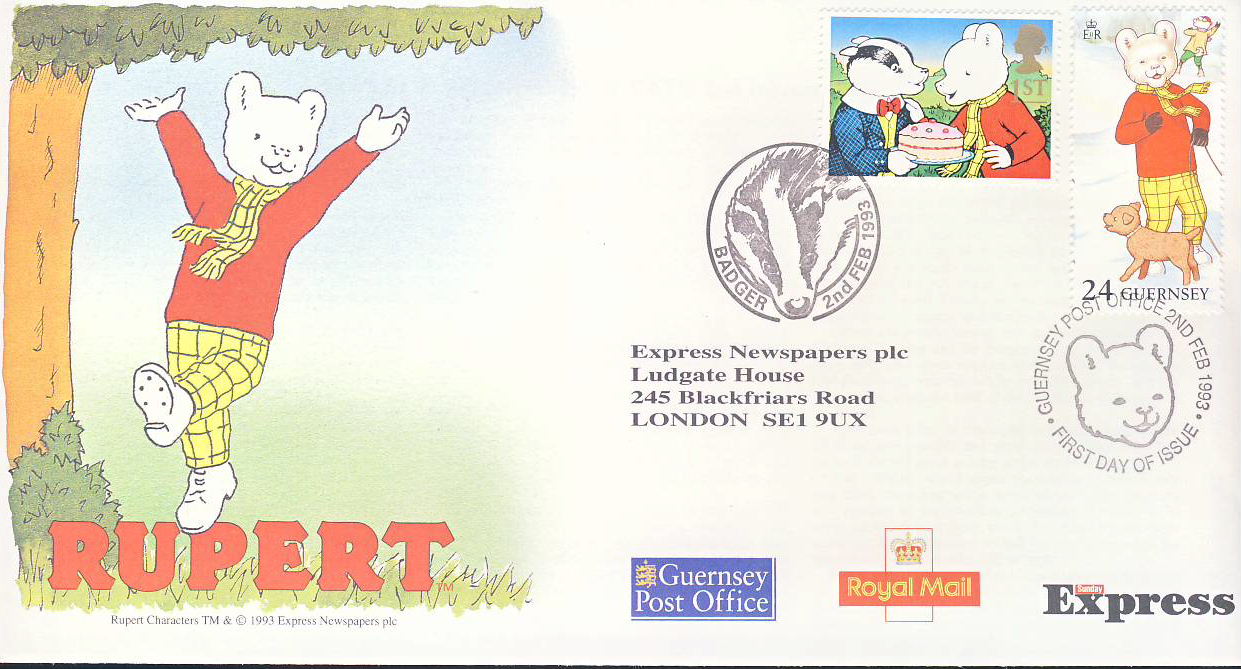1993 RUPERT BEAR & BADGER stamps cover Guernsey fdi EXPRESS NEWSPAPERS refd481