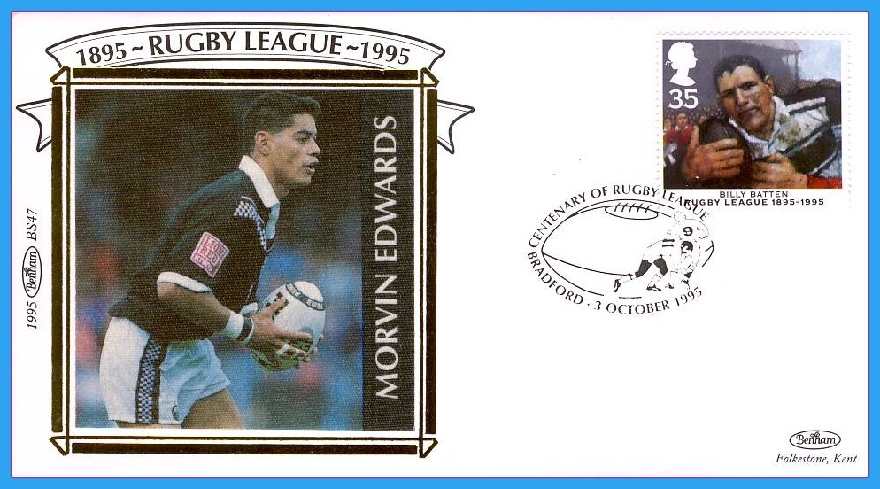 1995 BS47 Morvin Edwards RUGBY LEAGUE CENTERNARY Limited Edition (set was LIMITED to 5000 editions) Benham small silk cover BRADFORD special handstamp with Billy Batten 35p stamp.