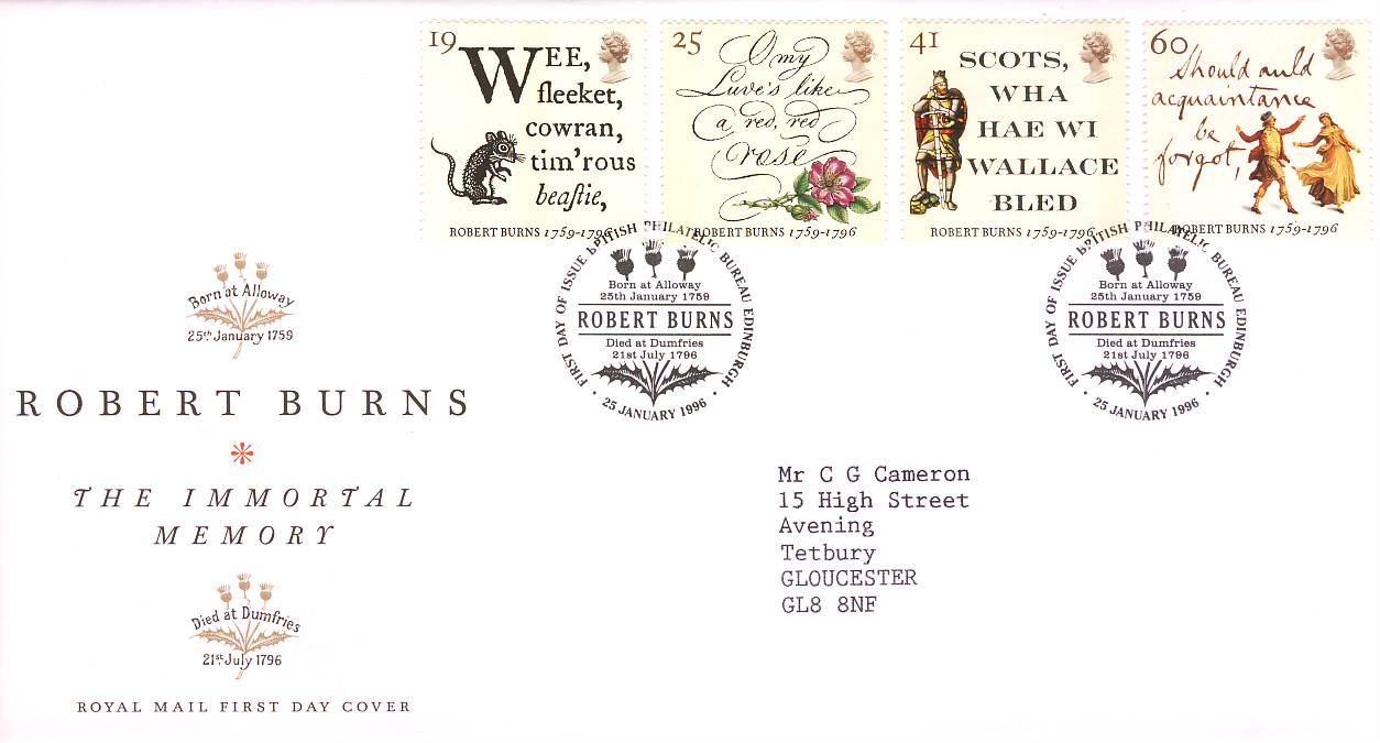 Robert Burns First Day Cover Bureau Edinburgh fdi 25 January 1996 with insert card refA514