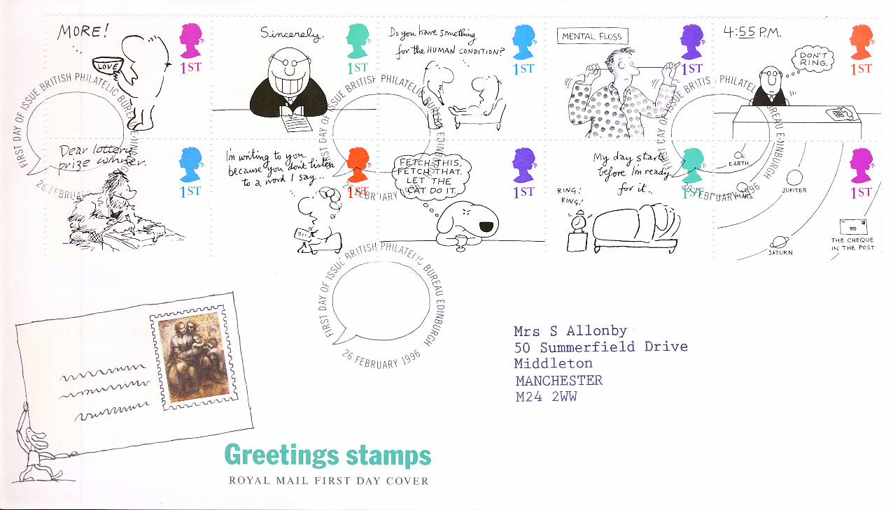 1996-02-26 Greetings Stamps Cartoons Royal Mail FDC Bureau A457