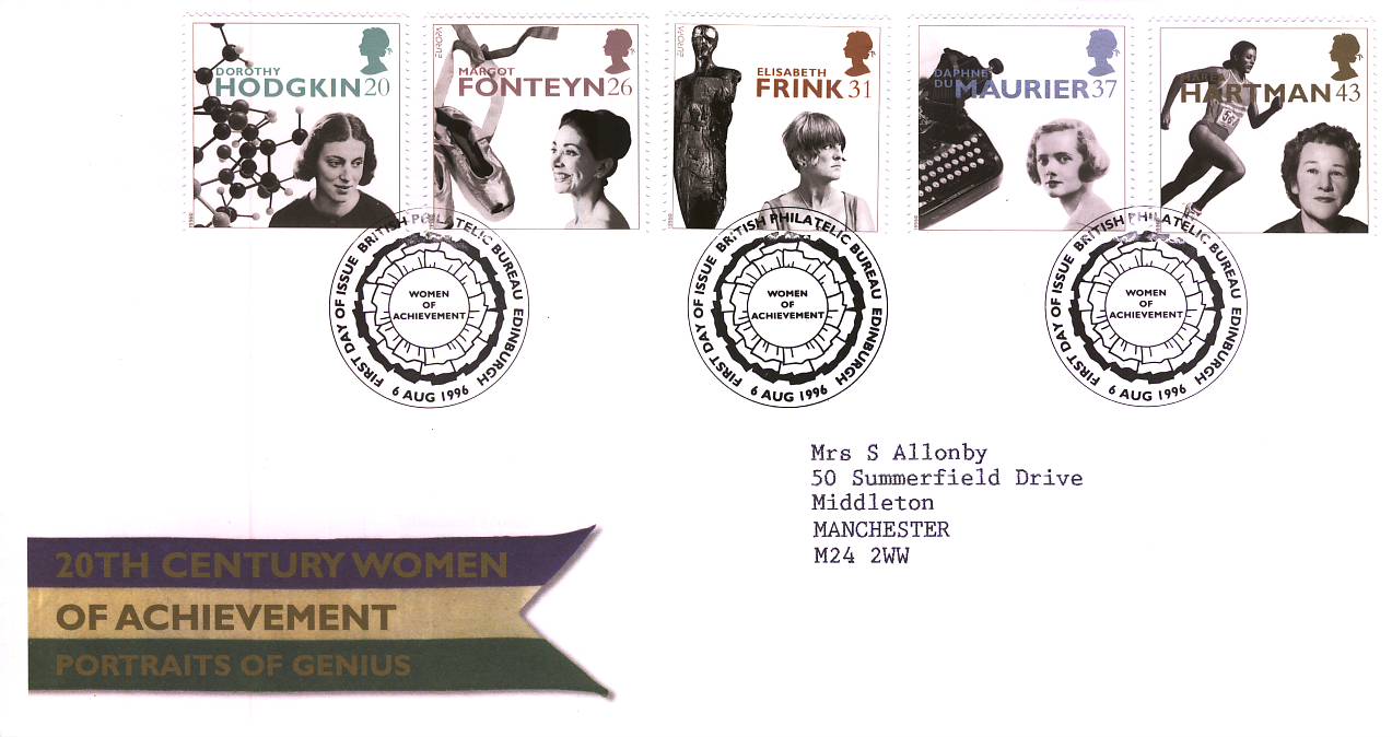1996-08-06 Famous Women Achievers FDC Bureau fdi with insert card refA19 1996 Famous Women Achievers FDC Bureau fdi Royal Mail First Day Cover 20th Century Portraits of Genius with insert card Typed Address refA19 Condition Please see full description and photo for condition report. Feel free to ask any questions. Thank you. Condition Report Please see full description and photo for condition report. Feel free to ask any questions. Thank you. Reference 1996-08-06 Famous Women Achievers FDC Bureau refA19