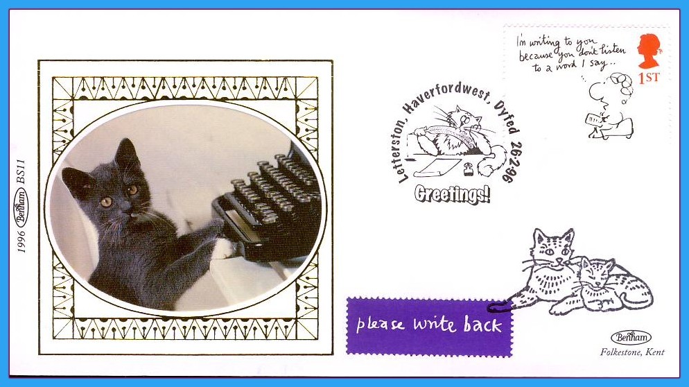 1996 BS11 LIMITED EDITION Benham Small Silk Cover GREETINGS Black Cat using a Typewriter Special Postmark Letterston, Haverfordwest, Dyfed.