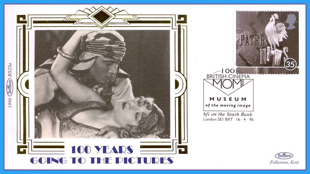 1996 BS23a Benham Small Silk Cover Museum of Moving Image bfi South Bank special handstamp with Pathe News cockrel stamp. Celebrating 100 years of the Pictures. refWestminster