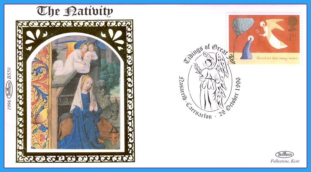 1996 BS50 NATIVITY Limited Edition Benham small silk cover NASARETH Caernarfon Angel special hand stamp.