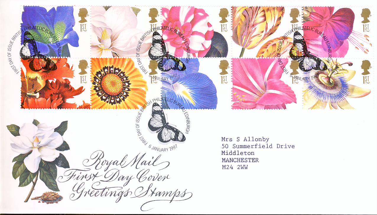 1997-01-06 Greetings Stamps Flowers Royal Mail FDC Bureau A458