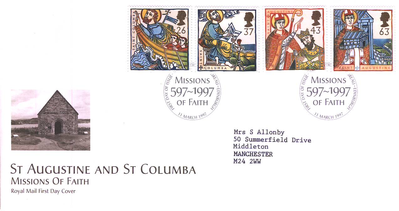 1997-03-11 Religious Anniversaries Missions Royal Mail First Day Cover Bureau fdi with insert card refA24 1997 Religious Anniversaries Missions FDC St Augustine and St Columba Royal Mail First Day Cover Bureau fdi with insert card Typed Address refA24 Condition Please see full description and photo for condition report. Feel free to ask any questions. Thank you. Condition Report Please see full description and photo for condition report. Feel free to ask any questions. Thank you. Reference 1997-03-11 Religious Anniversaries Missions FDC Bureau refA24