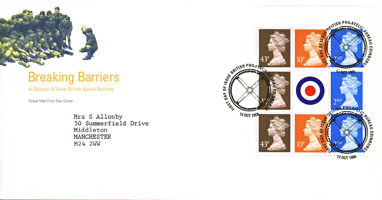 1998 Breaking Barriers A Century of Great British Speed Records Royal Mail FDC with Booklet Stamp Pane with bureau fdi and insert card 13.10.98 refA477