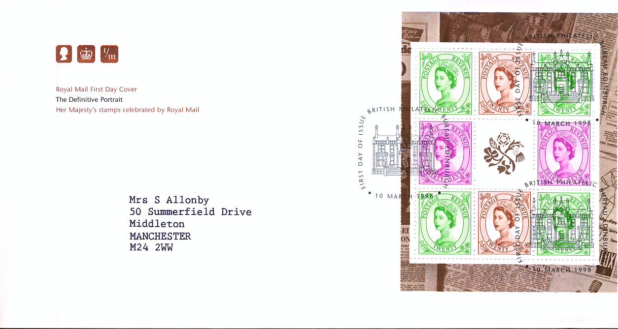 1998 Definitive Portrait Royal Mail Stamp pane FDC with Bureau fdi cancel 10th March 1998 and insert card refA475