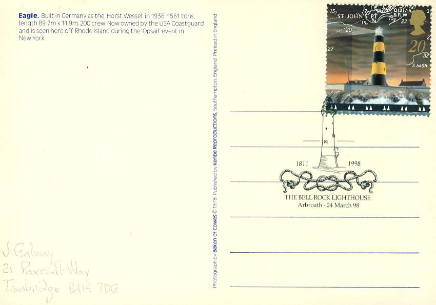 1998 EAGLE USA Coastguard Bell Rock Lighthouse Vintage Postcard refP1 Please see BOTH large photos and description for details.