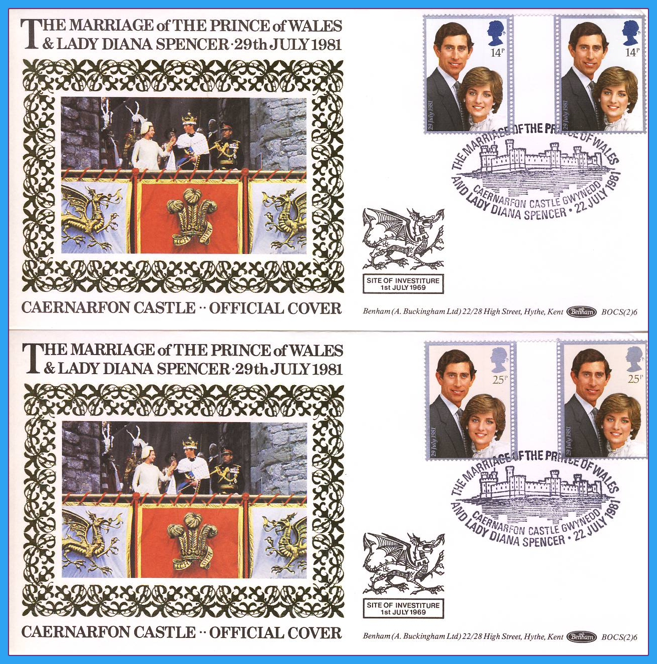 2 x 1981 Royal Wedding Prince Charles & Lady Diana Caernarfon Castle Offical Gutter Pair Stamps Benham First Day Covers. rc147