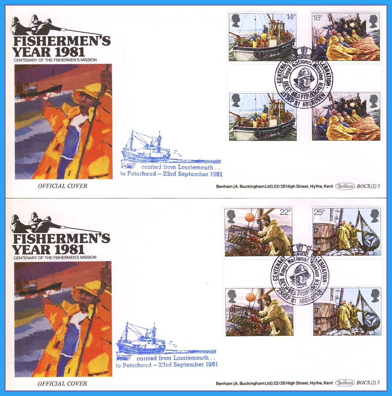 2 x Official Carried Lossiemouth to Peterhead 1981 Fishing Industry Gutter Pair Stamps Benham First Day Cover Aberdeen cancel rc148