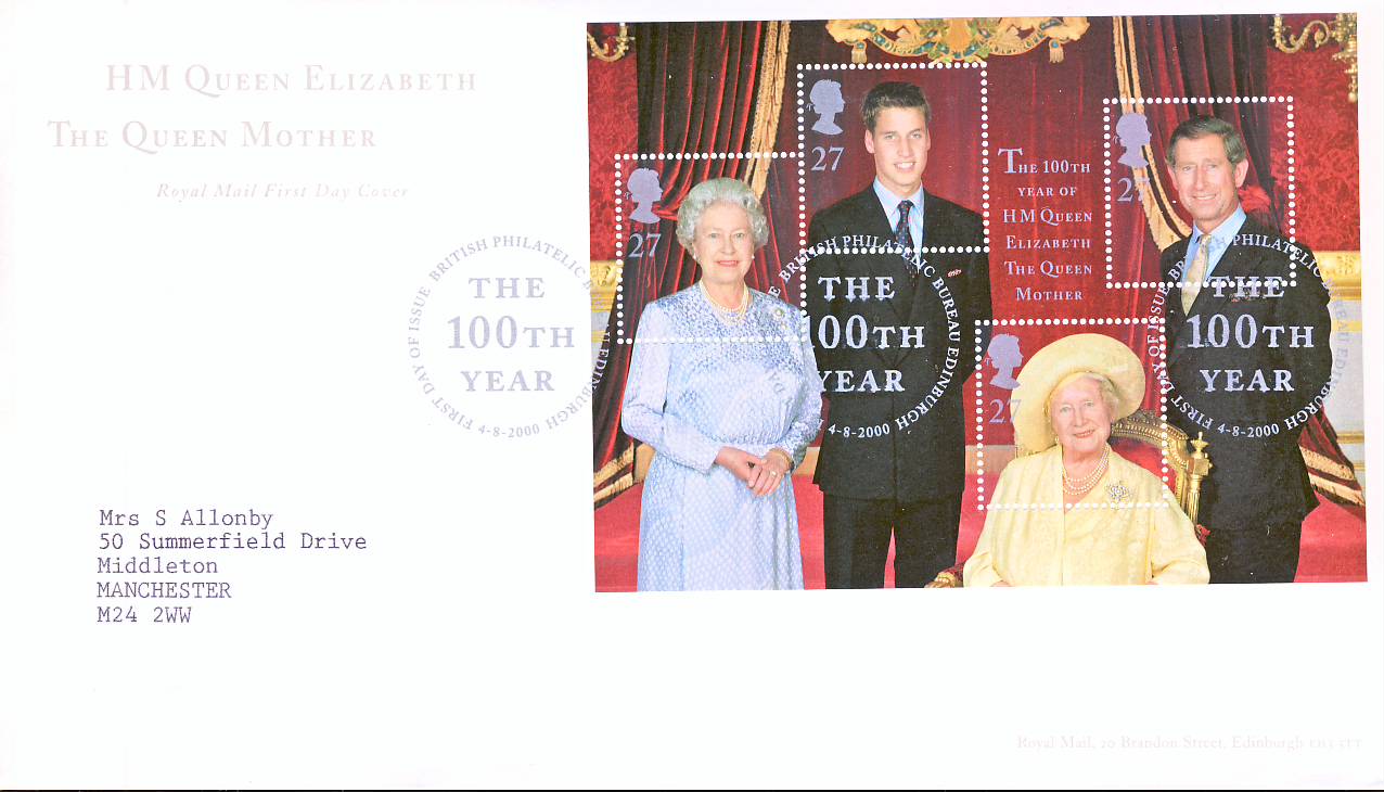 2000-08-04 Queen Mothers 100th Birthday minisheet FDC Bureau fdi A443