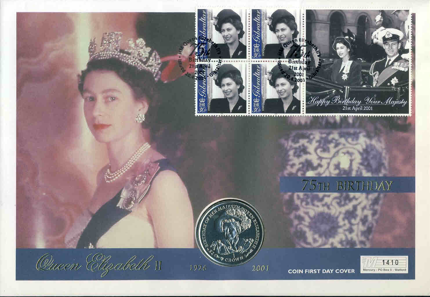 2001 Gibraltar Crown Coin FDC Queen Elizabeth II 75th Birthday stamps cover refLSC4 In very good condition. Please see larger photo and full description for details.