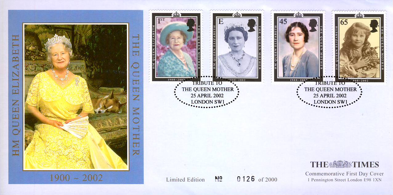 2002 LIMITED EDITION No.0126 of 2000 HM Queen ElizabethThe Queen Mother TIMES Commemorative First Day Cover with Tribute special handstamp. Sealed.