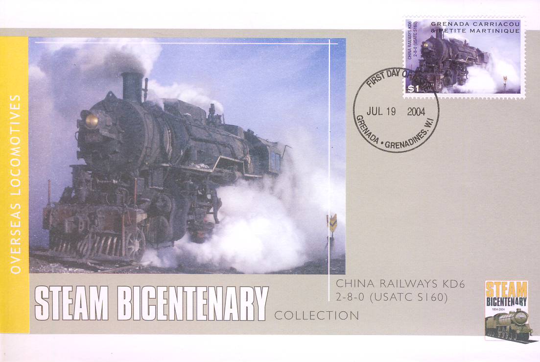2004 Grenada WI fdi China Railways KD6 2-8-2 Steam Bicentenary stamp commemorative cover. Very Good condition with insert card. Please see larger photo for details.