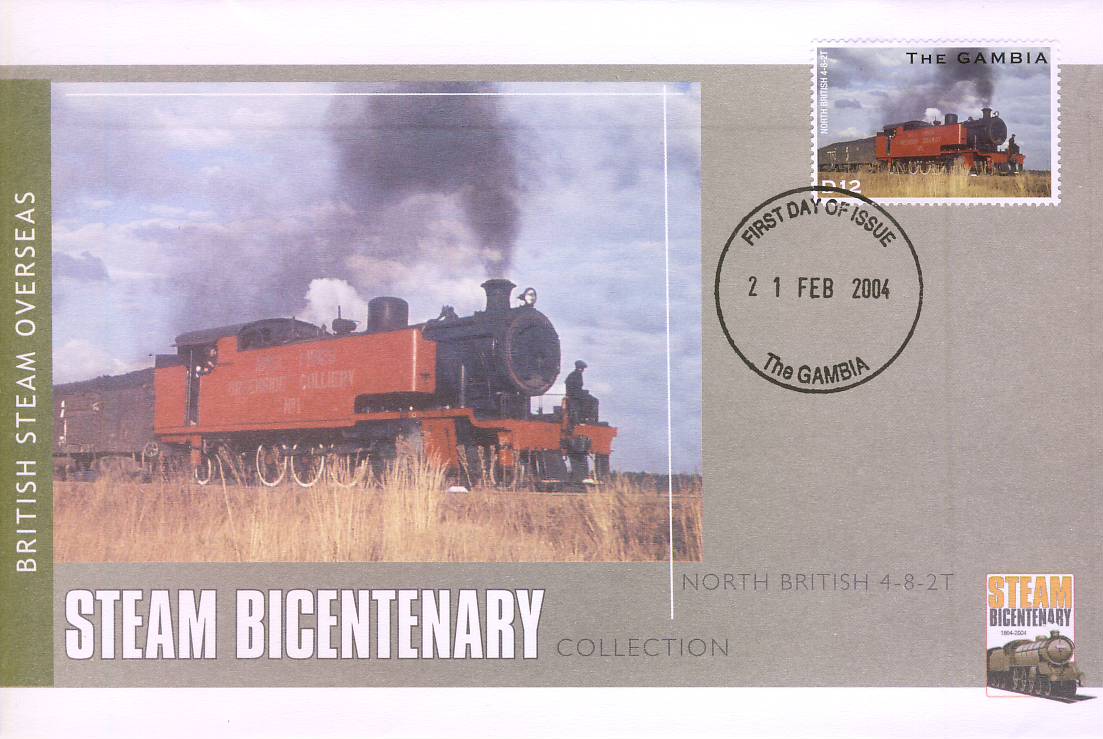 2004 The Gambia fdi North British 4-8-2T British Steam Overseas Bicentenary stamp commemorative cover. Very Good condition with insert card. Please see larger photo for details.