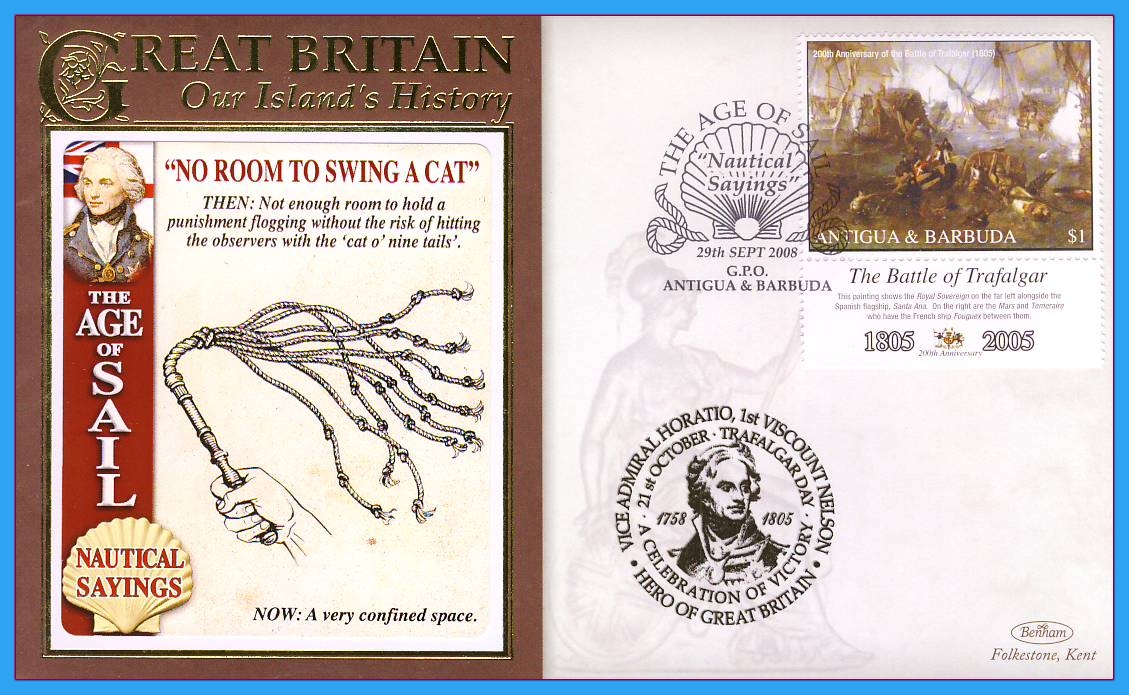 2008 Our Islands History The Age of Sail Limited Edition Benham cover NAUTICAL SAYINGS ‘No Room to Swing a Cat’ Nelson Battle of Trafalgar ANTIGUA & BARBUDA refC35