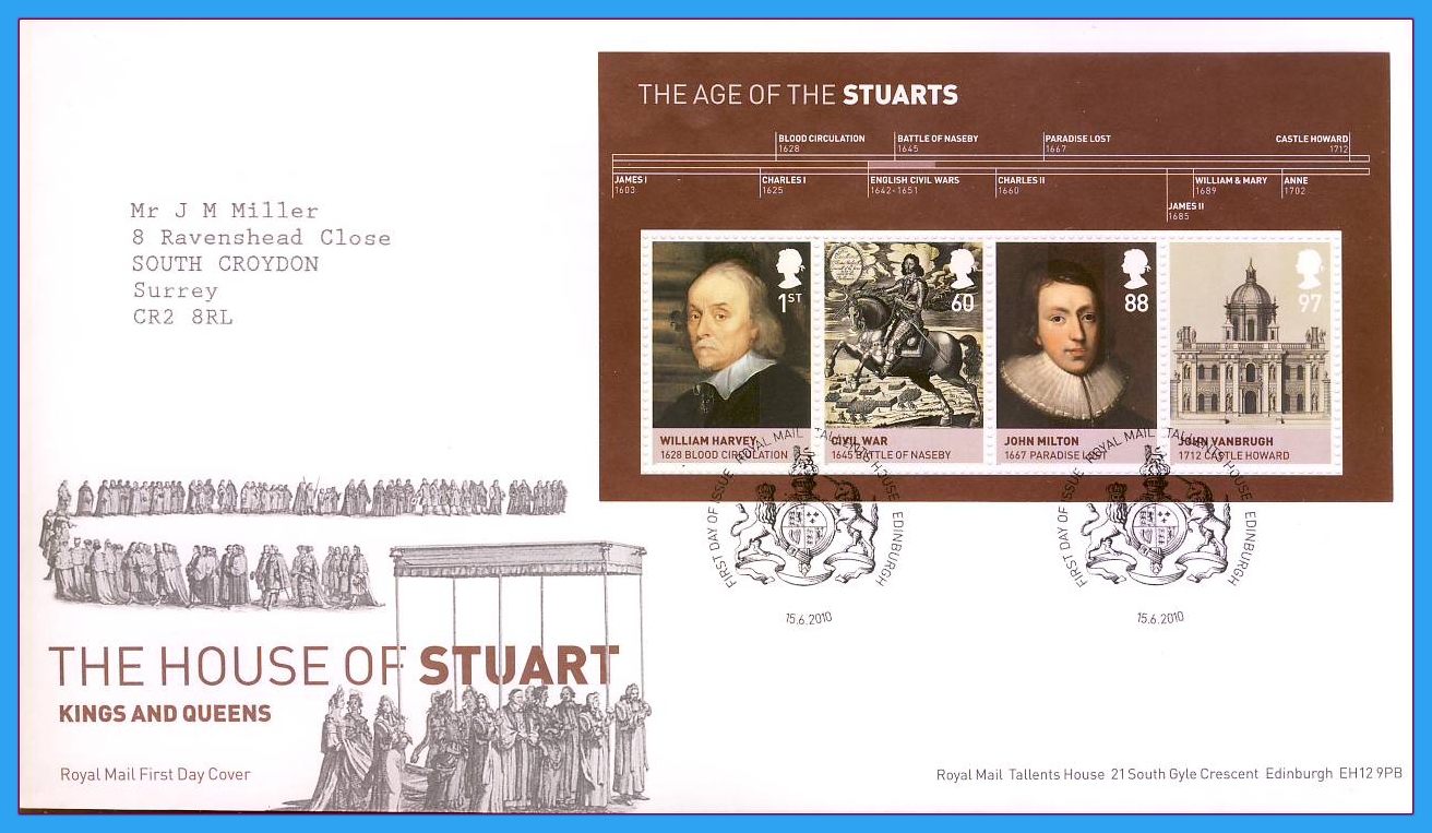 2010-06-15 The House of Stuart Age of the Stuarts Minisheet Stamps First Day Cover Kings and Queens William Harvey, Civil War Battle of naseby, John Milton, John Vanbrugh refc116