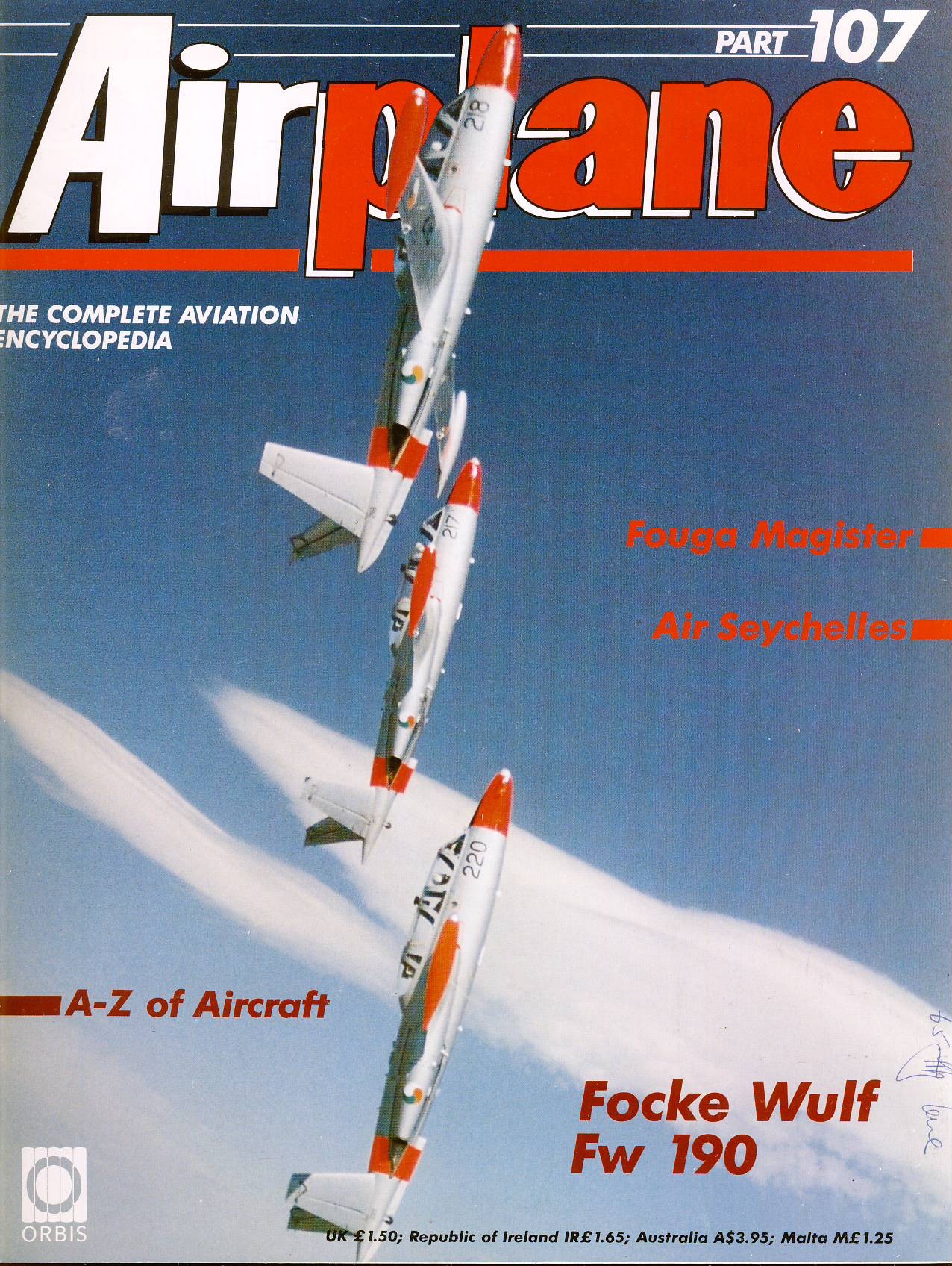 Airplane Magazine part 107 Focke Wulf Fw 190, Fouga Magister, Air Seychelles ORBIS Condition: Good with light handling creases. Writing on cover. Please see large photo for more information and view condition.Produced by ORBIS and Aerospace Publishing in the 1980s and early 1990s this weekly collection was billed as ‘The Complete Aviation Encyclopedia’. Each issue contains information, photos, illustrations and a 4 page centre feature which folds out.Condition ReportPlease see full description and photo for condition report. Feel free to ask any questions. Thank you.ReferenceAirplane Magazine part 107 Focke Wulf Fw 190, Fouga Magister ORBIS