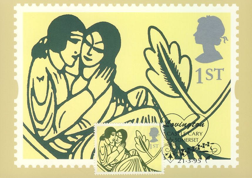 All the Love Poems of Shakespeare Postcard decorated by Eric Gill LOVINGTON Hearts special hand stamp 1995 Castle Cary Somerset postmark refE235 Special Hand Stamped Royal Mail Postcard in Very Good Condition – address label on reverse.
