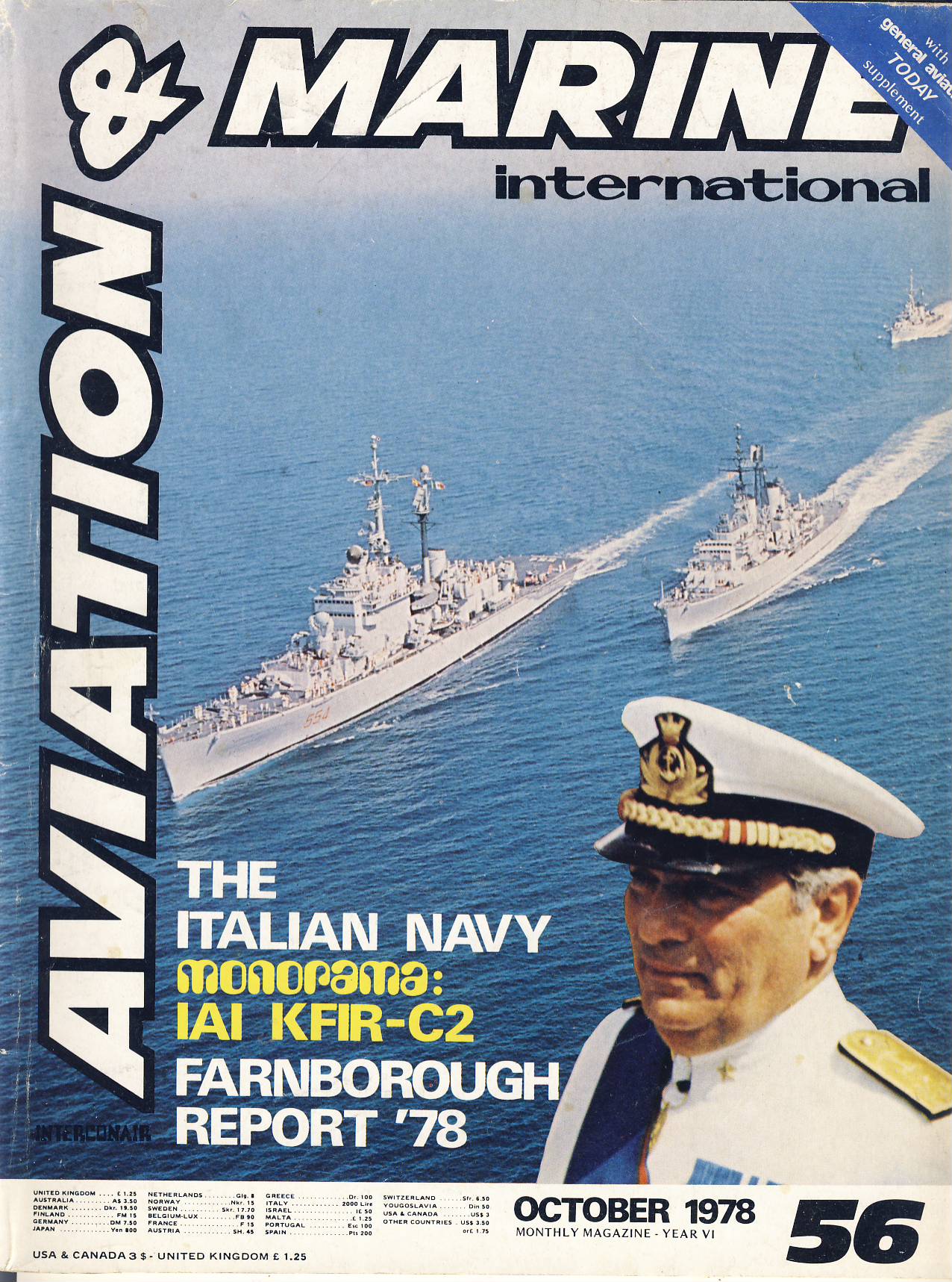 RARE Aviation and Marine International No56 October 1978 Interconair edition – dual language photos and specs – 82 pages plus special Farnborough 78 Report. Articles feature the Italian Navy with full weapons specs – Monorama IAI KFIR C2 with Pull Out Poster id 714 – General Aviation today approx 5 pages more articles and news items – Africa – Europe – North America – Soviet Union – Asia and Pacific … and much more. RARE very small print run in the mid to late seventies. International version of the Italian title Interconair Aviazione Marina. Printed in Italy.