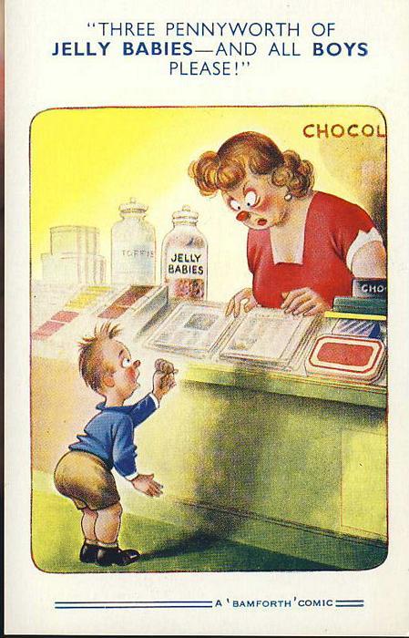 BAMFORTH No.1860 BOY JELLY BABIES sweetshop Vintage Comic Postcard refB1