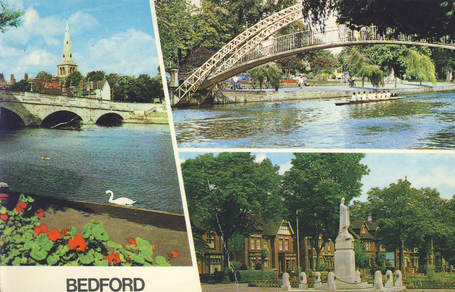 BEDFORD VIEWS Old Postcard refP9 The Bridges and War Memorial Embankment Gardens. Pre-owned used condition with name address and message on reverse. No stamp.