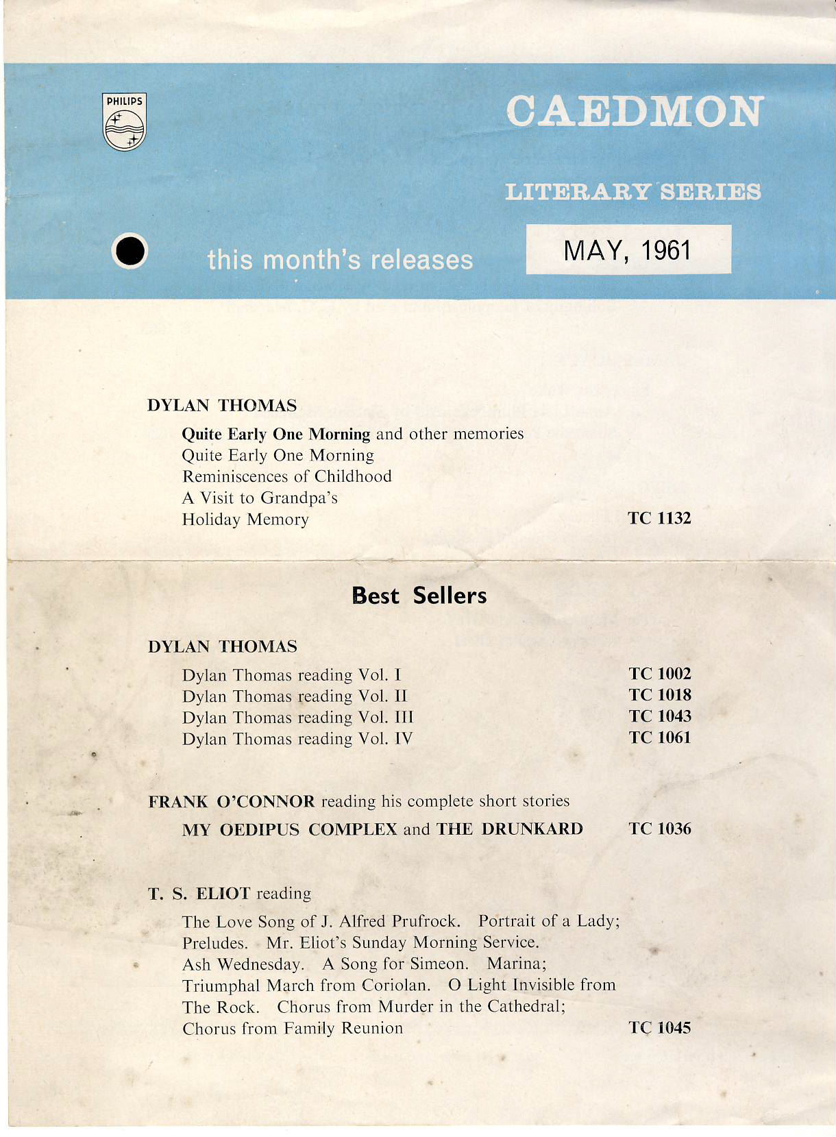 CAEDMON Literary Series MAY 1961 releases leaflet ref101652 2 sided folded vintage leaflet measures approx 28cm x 21cm pre-owned in well used condition.